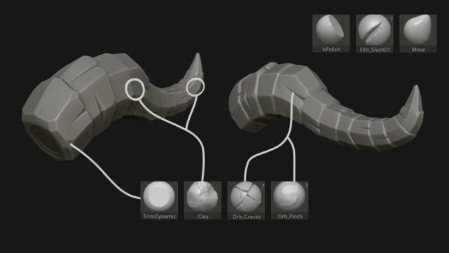 在ZBrush中,我雕刻较小的细节,这是我最喜欢的部分!ZBrush中的大部分工作都围绕着这个项目的几个画笔。Trim Dynamic和hPolish用于平面边缘和表面,Orb_Cracks用于雕刻划痕,Orb_Pinch用于改变裂缝的宽度,最后,Clay用于任何较小的细节,例如凹痕。我还会在这里和那里使用Orb_Slash笔刷,并且经常使用移动工具来修改子工具的整体形状。