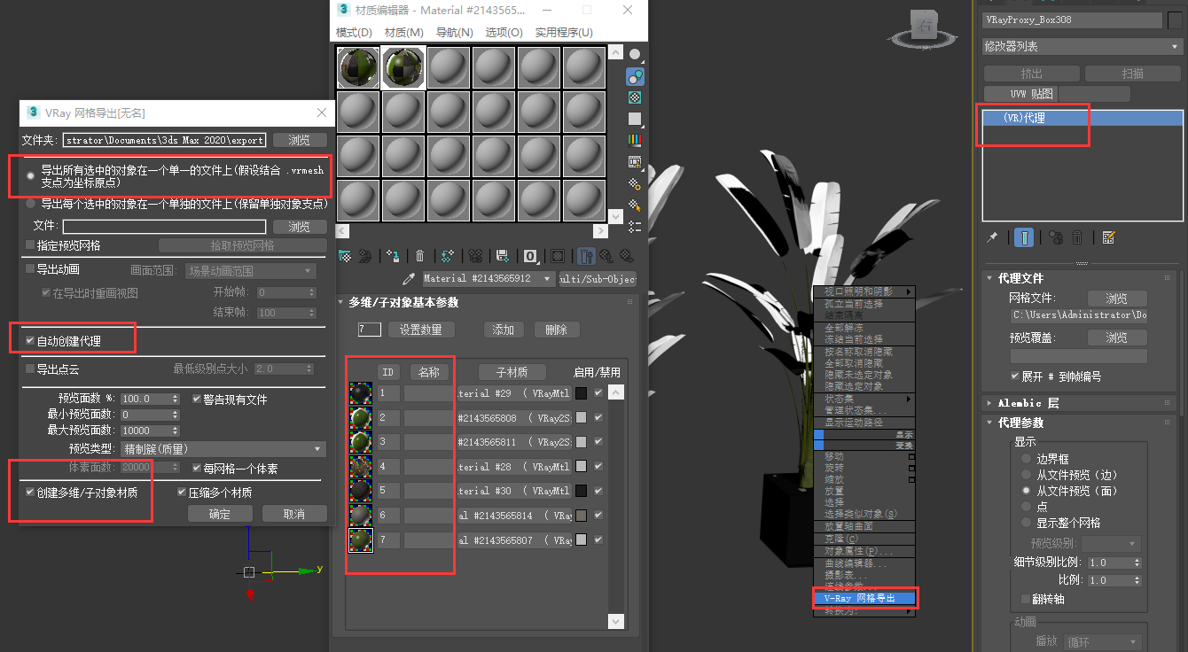 我们选择第二种,右键网格导出,选择第一项,导出所有选中的对象在一个单一文件上,勾选右下角创建多维子对象。我们可以看到创建后的对象已经变成了一个多维子材质。