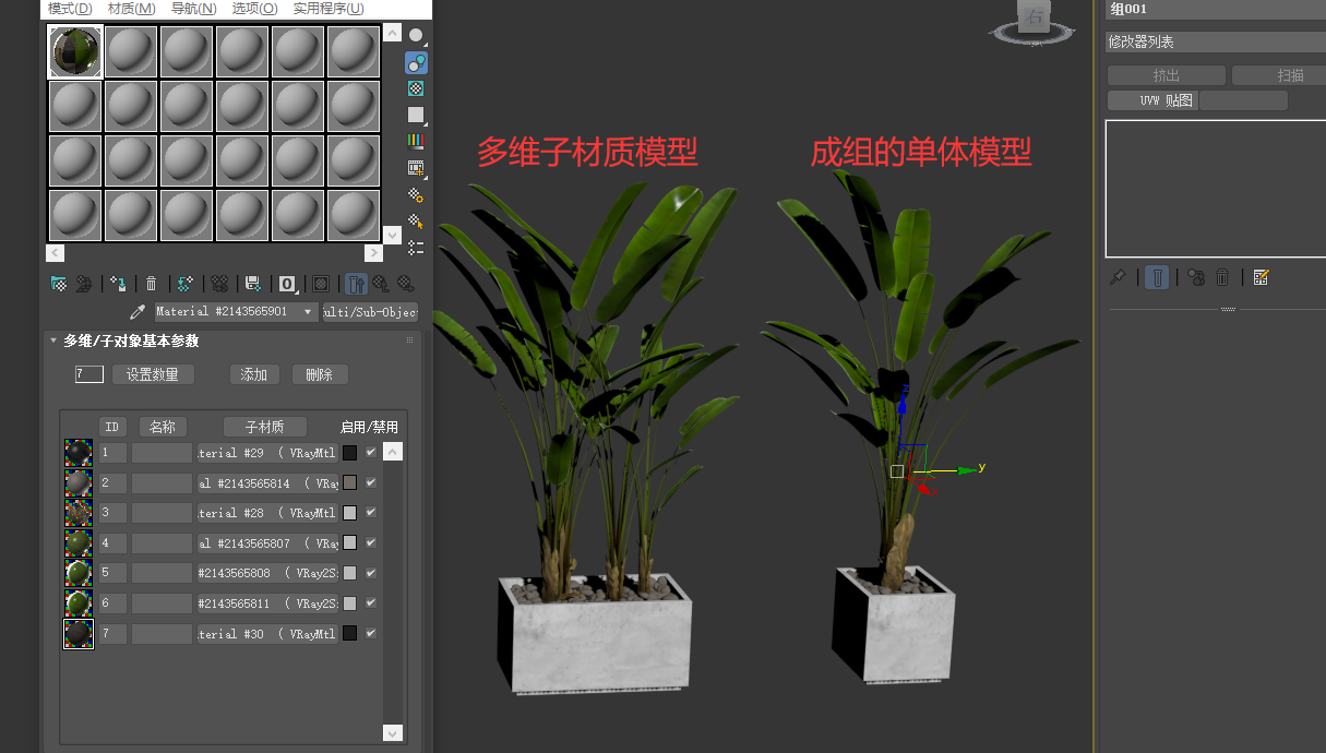 有两种模型,一种是模型材质为多维子材质,另一种是成组在一起的单体模型。
