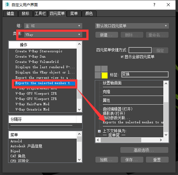 找到四元菜单,在类别中找到VR,将英文的VR网格导出拖动到右边的菜单中,这时候右键就有了VR网格导出的选项了。
