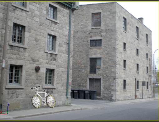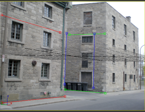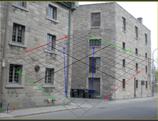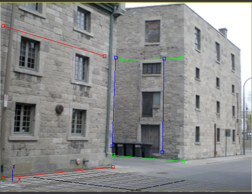 拖动 Gizmo 进行移动,或拖动 Gizmo 的端点以调整大小。目标是要对齐 Gizmo,使它们可指示出位图场景的没影点(或多个没影点)。排列 Gizmo 的红色 (X) 和绿色 (Y) 对,使其看起来彼此是垂直的。排列蓝色 (Z) Gizmo,使其与垂直线对齐。