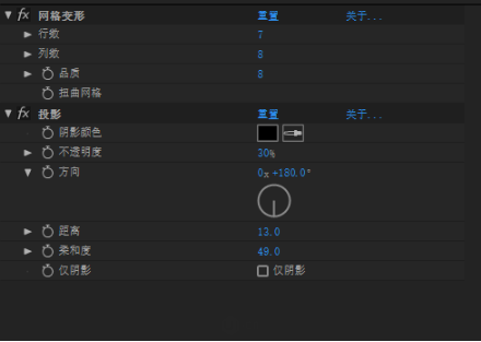 那么,首先建立一个制作gif图的标准合成(800*600,24fps)。再建立一个固态层作为背景,颜色:E3E3E3。然后绘制一个170,90大小的矩形,并将它至于合成的中心,圆度为20,颜色:262626,并给它添加网络变形和投影两个效果。(这里网格变形的参数仅仅是细分数,具体的变形还需要自己具体去扭曲)详细参数如下: