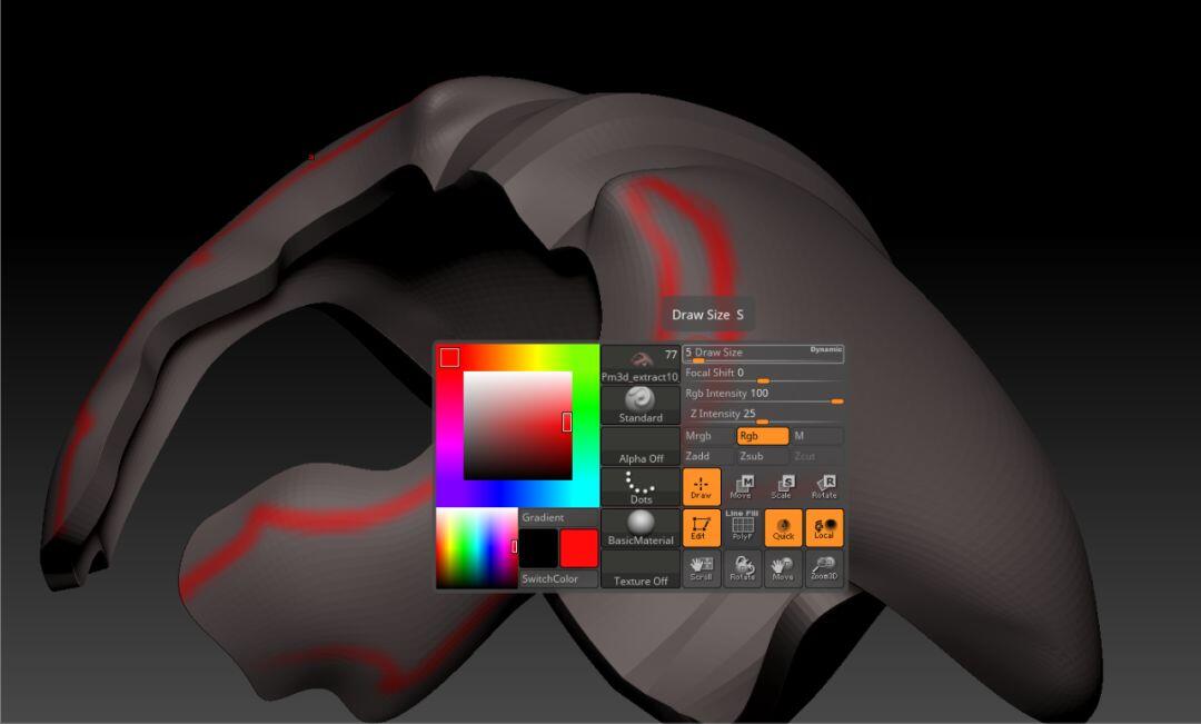 我选择的是standard笔刷,按空格键把笔刷的雕刻功能去掉,打开rgb,选择红色,对你要进行制作的部分进行绘制,为了方便我们去找形。
