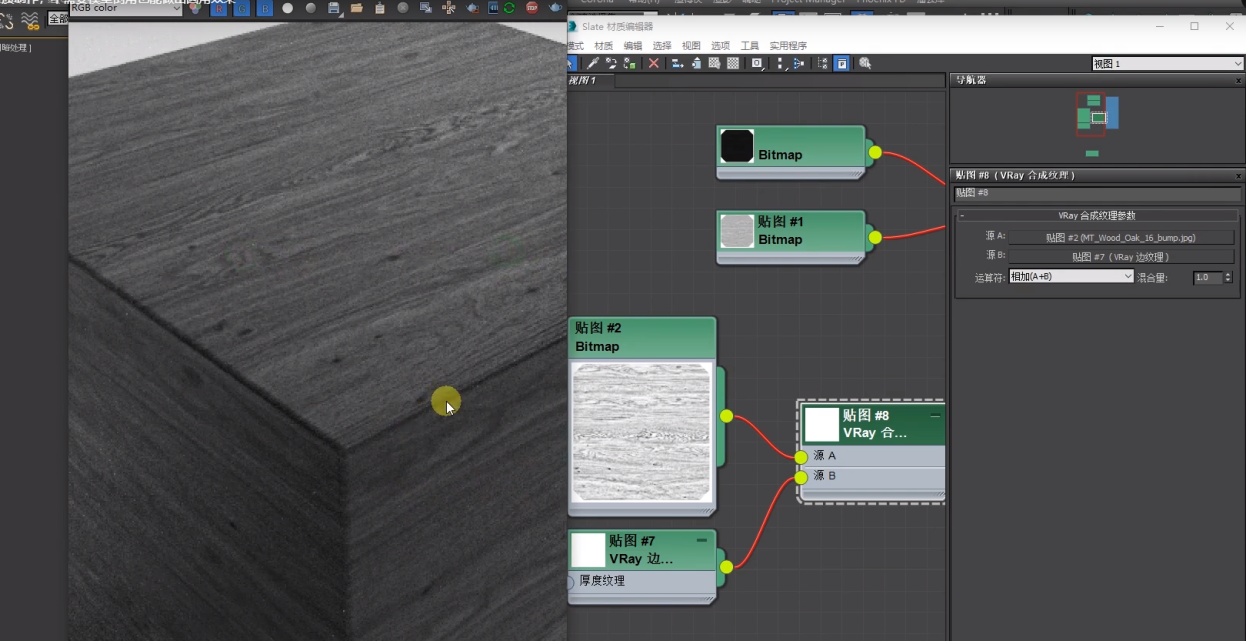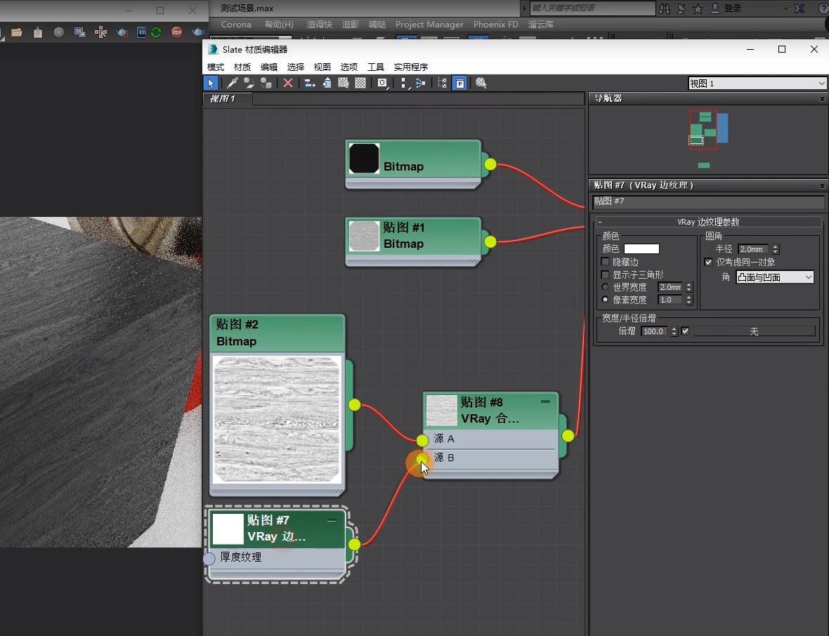 可以在凹凸通道中先添加vray的合成纹理,将原本的凹凸贴图和边纹理同时链入AB两个通道。
