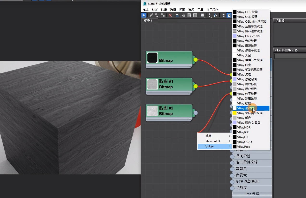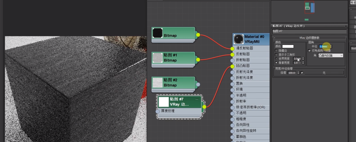 只需要一个操作就可以搞定。在材质的凹凸通道里面,添加VR的边纹理贴图。