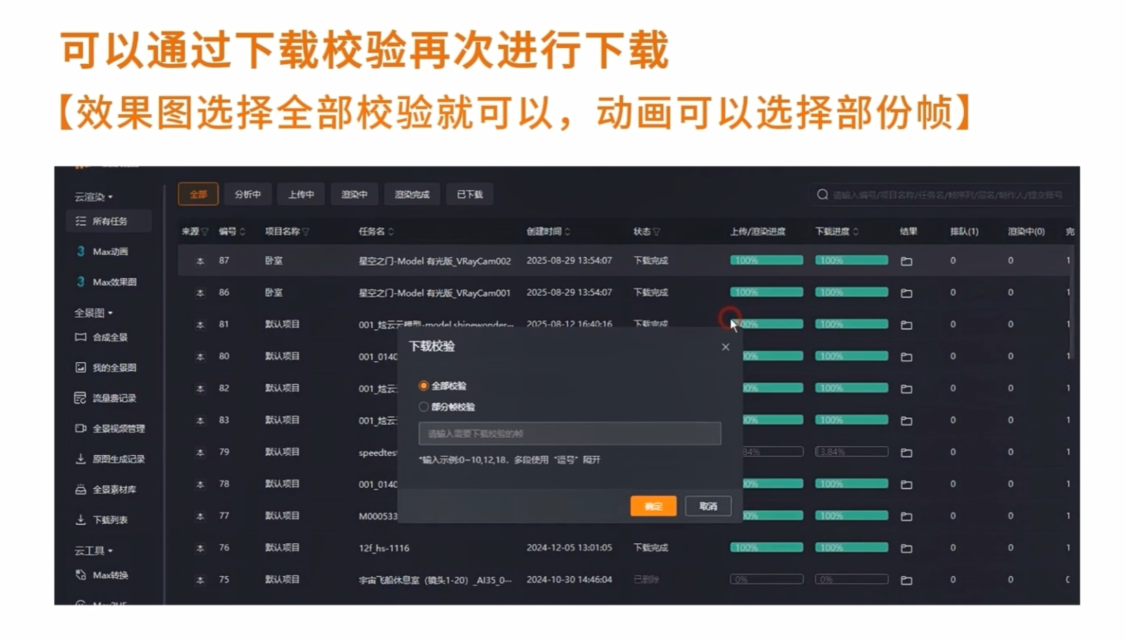 另外就是7天内下载了文件却不小心弄丢了,还是有其他办法下载的,你可以在客户端渲染结果这里点击鼠标右键,看到一个下载校验功能,可以通过下载校验再次进行下载。效果图选择全部校验就可以,动画可以选择部份帧。
