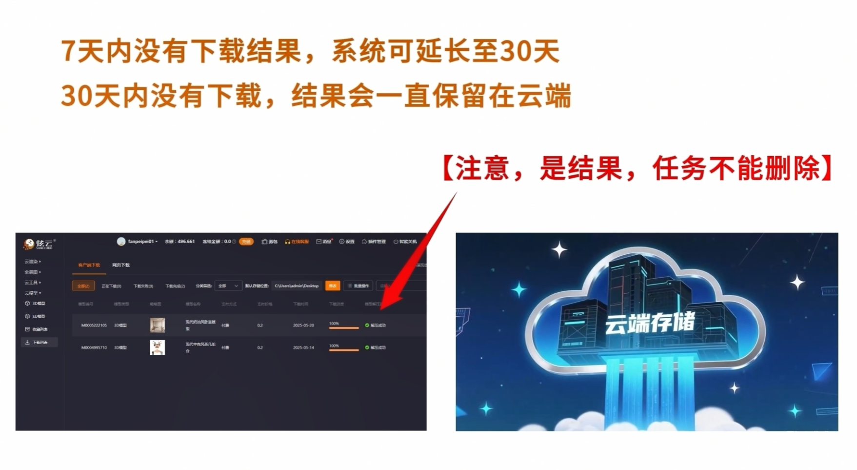 30天内如果用户下载了结果,云端才会清除该结果,确保节假日或者用户忘记下载导致超过7天结果不存在