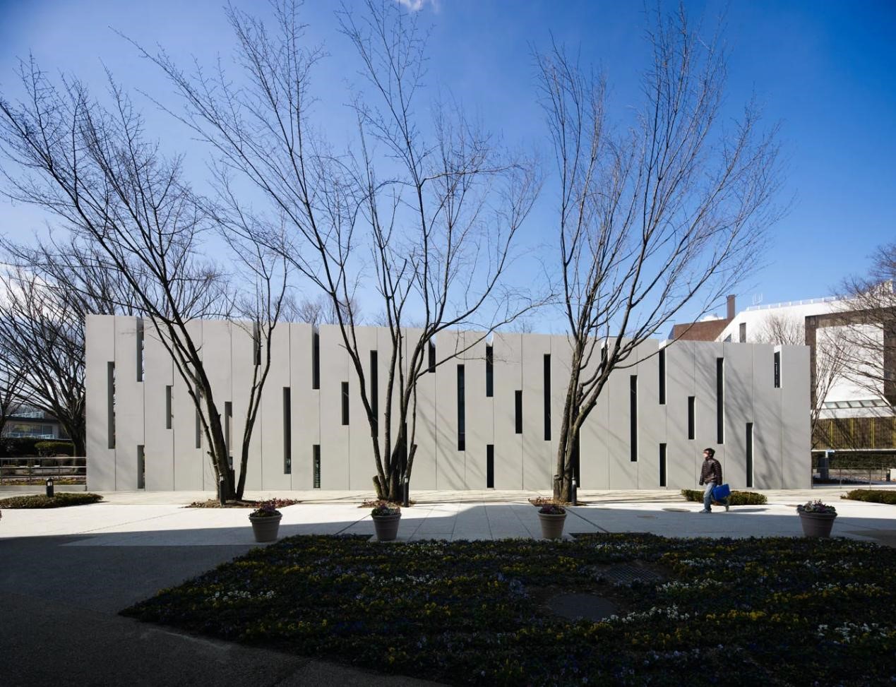 水田艺术博物馆坐落在一所日本大学校园内,面积达7000平方英尺,建成于2012年。馆内展示着日本浮世绘系列的珍贵藏品,以及来自学校和社区的优秀艺术作品。受到基地附近的树木影响,博物馆的高度被限制在了9米。因而,该项目有近乎一半的体量都处在地面标高之下。同时,博物馆设有2条尺寸合适的坡道。一条通往博物馆画廊,另一条则通往校园信息中心。位于东部入口和西部画廊休息室的机械空间与坡道空间,共同创造了一个周边环境缓冲区,以此避免画廊墙壁外侧受到阳光直射。值得一提的是,这个博物馆的立面图案,灵感来源于版画中的雨水。