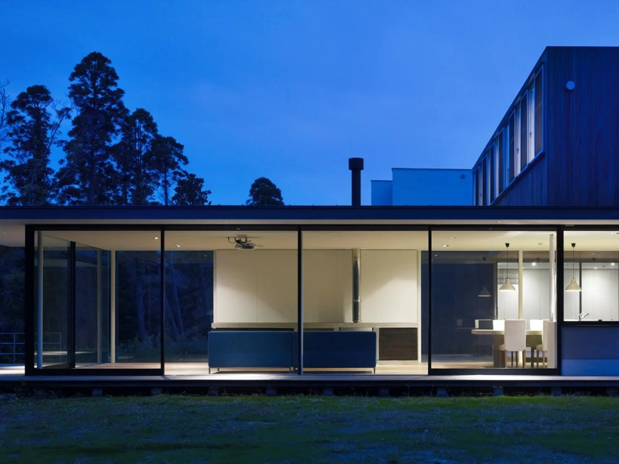Riverside House是日本千叶县的一个周末度假胜地,它位于一片毗邻河流的绿地上,项目建成于2007年。其特别之处在于,这栋住宅与河流呈平行关系。两个垂直体量从地面向河流突出,一个是带卧室和浴室的私人宿舍,另一个则是宽敞的起居空间。在两者之间,还有一扇大型玻璃推拉门,推开之后,有一个可以欣赏到河流景观的户外露台。建筑的外立面采用了雪松木与混凝土建造,有助于抵挡北风侵袭。