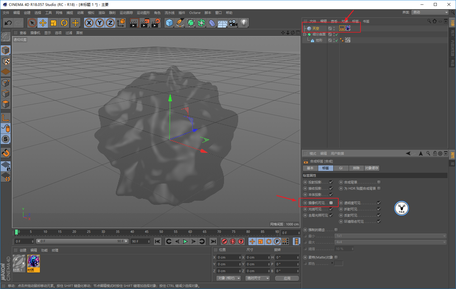 给天空添加一个合成标签,并把摄像机可见的勾去掉: