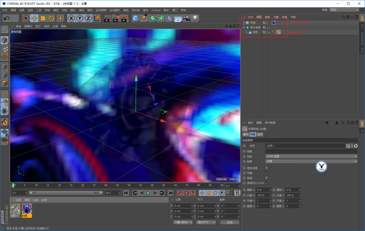 把发光材质球给天空,透明材质球给地形: