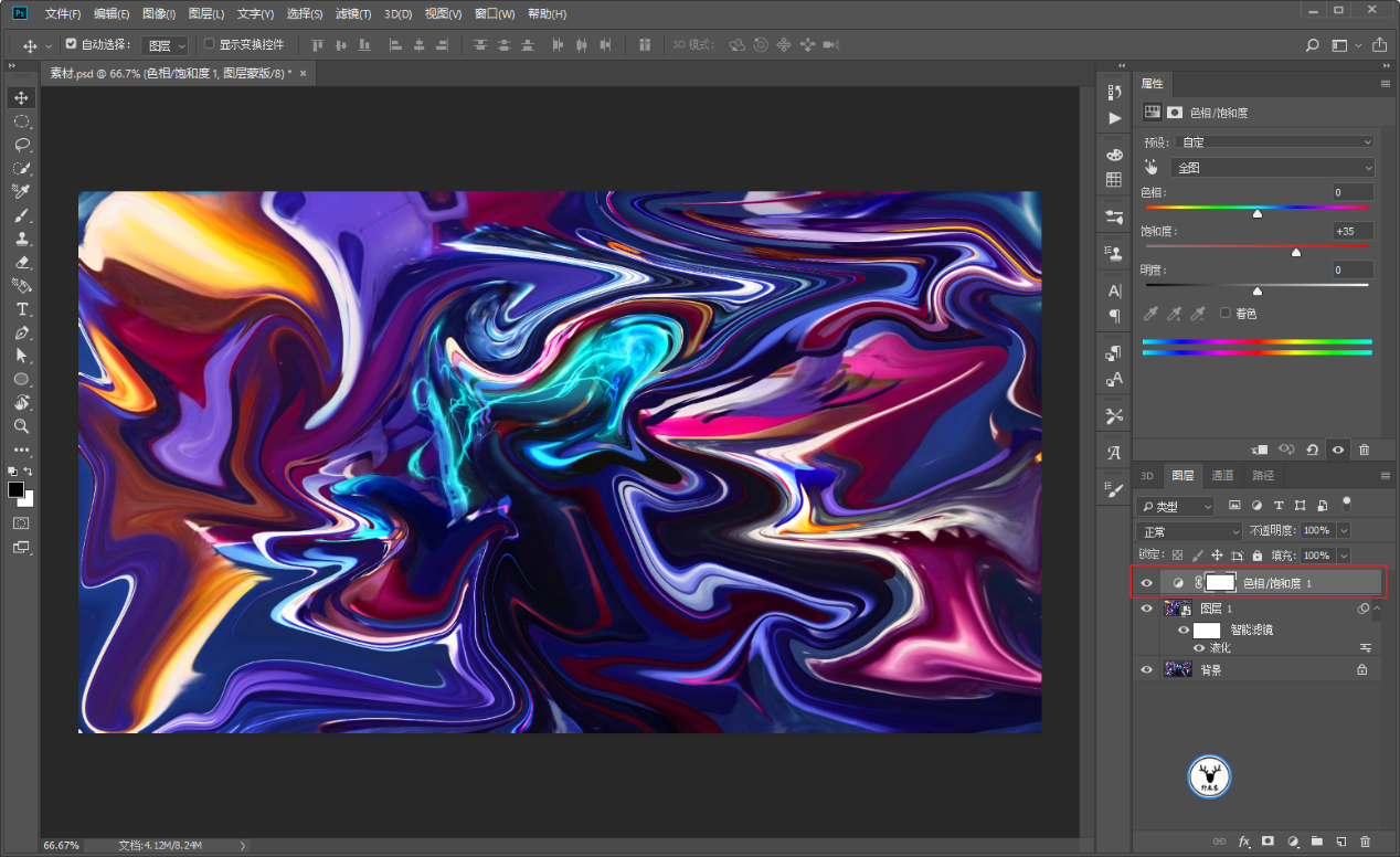 因为图片素材我感觉颜色还不够艳丽,所以给了个色相/饱和度调整图层增加颜色的饱和度: