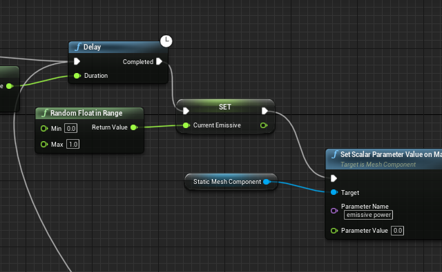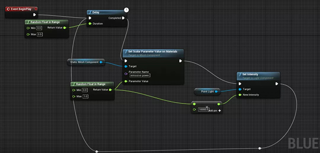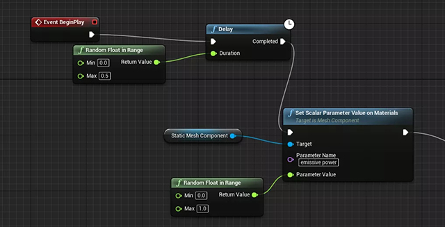 而Duration值的话需要输入一个随机数Random Float in Range,范围大概在0到0.5之间,因为推迟的时间不能长,接着开始给模型的emissive设置一个随机值,首先用节点Set Scalar Parameter Value on Materials获取材质里面暴露出来的参数emissive power,Parameter Value同样给一个随机值,范围0-1。