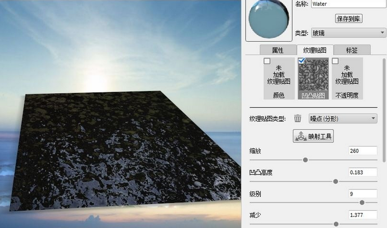 2、上面的平面赋予玻璃材质,使用噪点程序贴图类型,并调整合适的参数。
