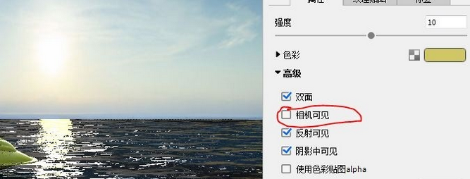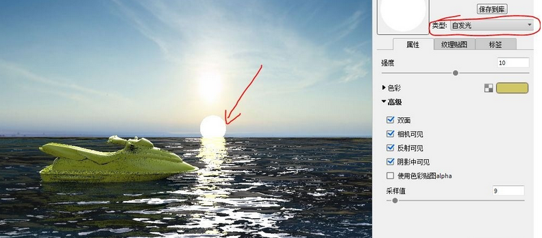 7、接下来建立一个球体,然后赋予自发光材质,调整到远处水面消失的地方,调整合适的灯光亮度,直到在水面和天空交接的地方有合适的倒影。