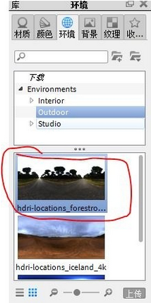 5、从KeyShot自带的室外HDR环境中选择一张载入,这里也可以选用其它的室外HDR环境 ,本身就带有阳光。也可以使用KeyShot自带的天光系统建立一个HDR,时间以接近傍晚为好。