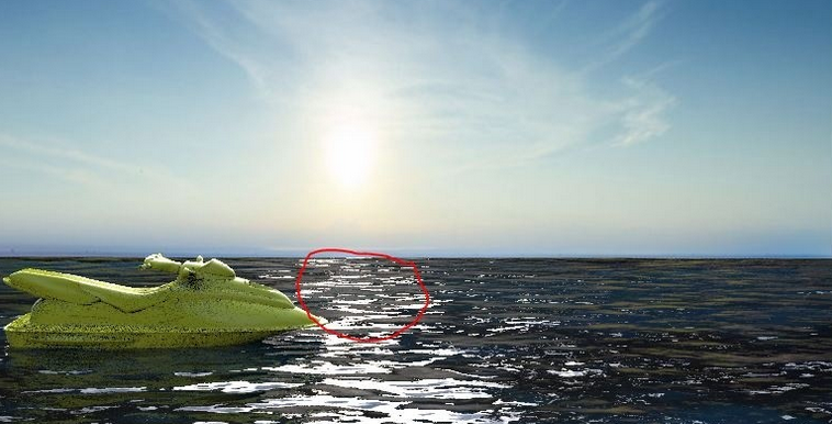 6、到此为止效果基本模拟出来了,但是可以看到图中红圈位置实际上应该有很强的太阳的倒影,但是由于没有那么合适的HDR和角度,很难得到那样的效果。