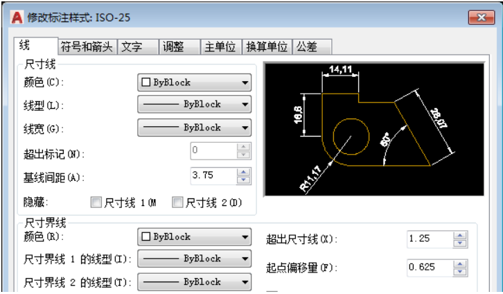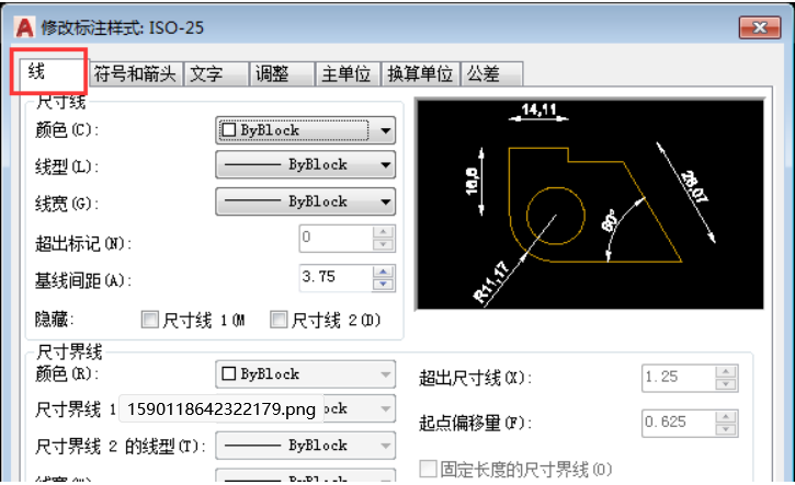 第5步、进入修改标注样式ISO-25面板,选中线选项。然后在尺寸界线就会发现隐藏的尺寸界线1与尺寸界线2前面打勾了哦。