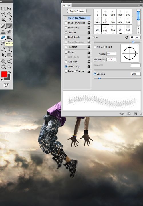 步骤4、选择“splatters”形状的橡皮擦工具,擦掉人物的腿,达到爆裂的裂纹效果。