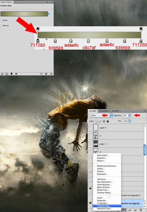 步骤12、营造作品气氛。在图层标签的底部选择填充或者调整图层,用“渐变映射”和“可选颜色”调整背景颜色。效果如下: