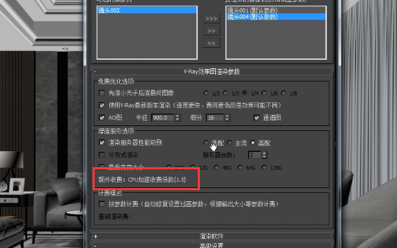 总结:对于渲染时间很短的小场景,因为渲染时间很短打开场景时间占比比较大,渲染时间没有明显提升,高配机器加上增值费后会比主流服务器贵很多。建议渲染小图选择主流服务器。