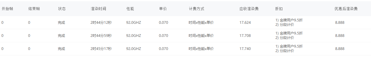 将该场景提交主流服务器,渲染时间分别为2小时44分12秒、2小时44分59秒和2小时45分17秒,由于炫云有8.888元小封顶的原因,渲染价格都为8.888元。