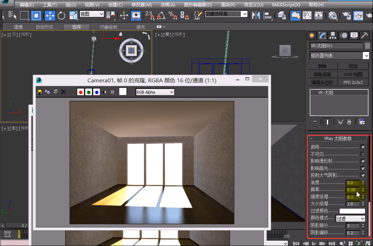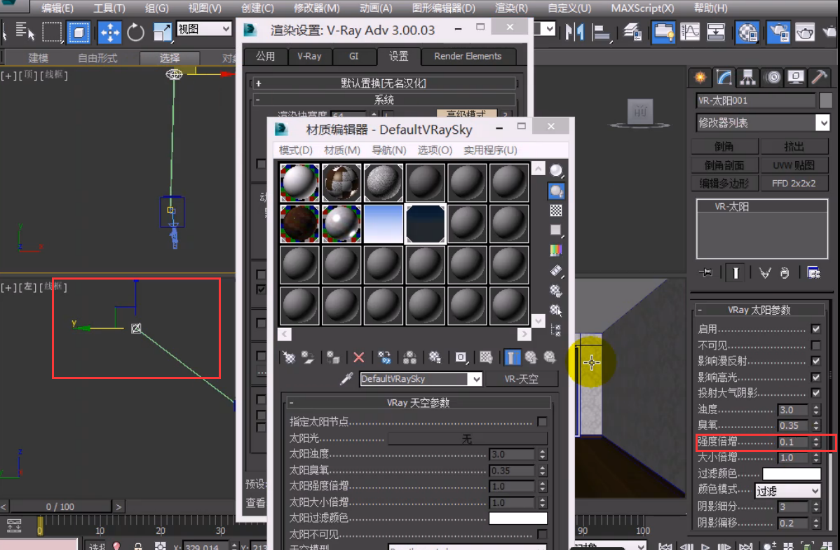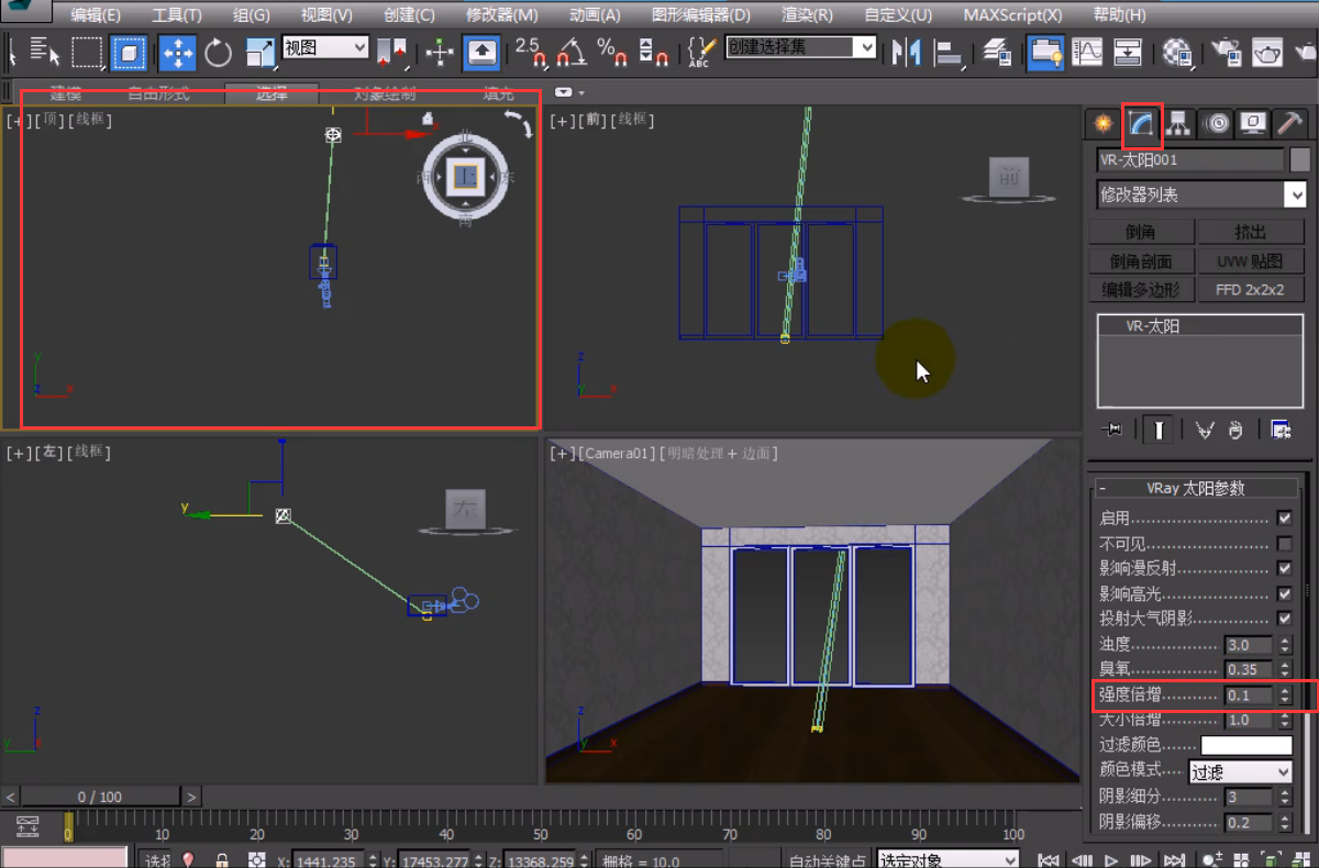 今天为大家讲解VRay太阳,首先我们进入修改面板。把强度倍增设置的低一点,这里我们设置为0.1,