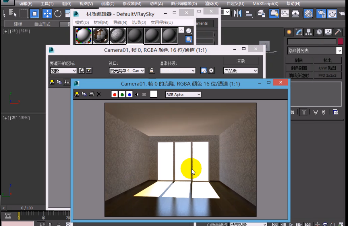你看贴图就自动在这个地方产生了它现在就代替了VRay天空贴图,那么我们如何去控制天空贴图的参数呢,在这里我们超前一点讲解。我们先打开材质编辑器,我们选择一个空白的材质球,按住DefaultVRaySKY(VR-天空)不动拖到空白的材质球上。