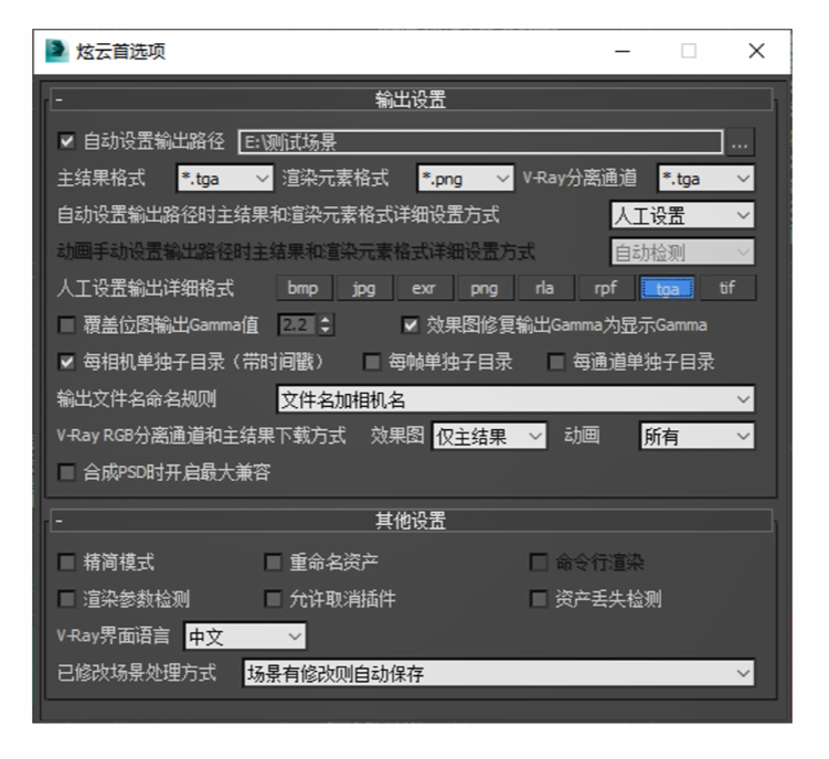 比如想要输出的结果是32位的tga格式,那就可以在首选项上预先设置好,后续我的任务如果设置输出这个格式,都会按照这个来。